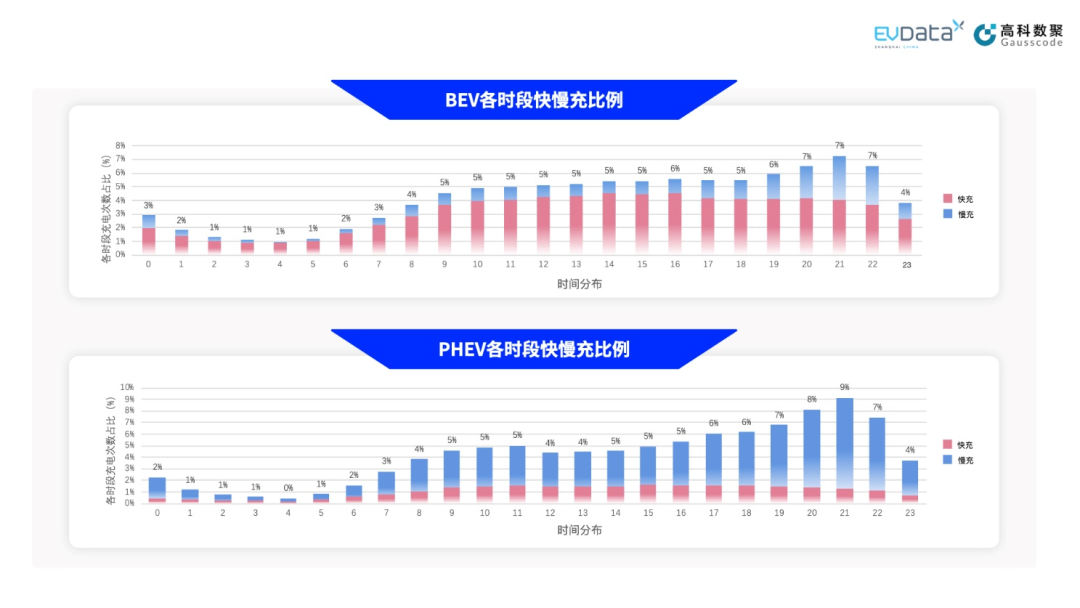 BEV和PHEV的充电策略差异也同样体现在了快慢充选择上。下图中,横轴则为24小时的时间分布,纵轴表示各个时段内充电次数在总充电次数中的占比,其中蓝色表示慢充,红色表示快充。图中展示大部分情形下BEV车主选择了快充,约占全部充电次数的75%左右;即使选择慢充,其充电行为也主要发生在夜间,考虑到慢充补能时间较长,利用当天行程结束后的闲暇时间进行补能更为适宜。