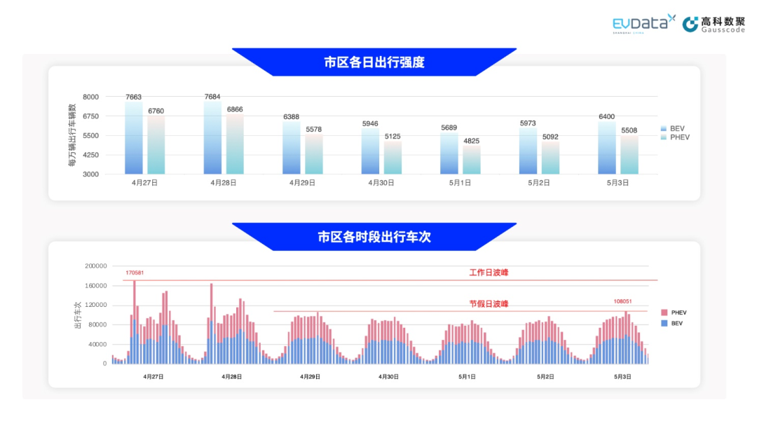 为更好体现新能源汽车在不同场景下的出行特征,五一期间新能源的出行数据将区分为市区出行和跨市出行分别进行展示[8]。