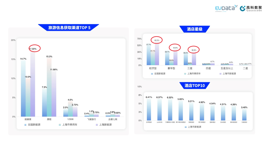 上海新能源关注人群在旅游方面表现出活跃度高且热情。相比全国的新能源关注人群,他们倾向于使用马蜂窝、携程等平台获取旅游信息和进行预订,同时也喜欢持续制作旅游攻略和经验分享。在选择酒店时,他们倾向于选择中高端酒店如全季酒店、山水时尚、万豪等;其中热门旅游目的地,则包括杭州、苏州、南京等,而黄山、乌镇、莫干山、千岛湖等景点备受青睐。对于公共交通,他们倾向于使用公共汽车、火车等短途公共交通工具,可能与新能源车的使用特点和续航里程相关。基于这些特点,汽车制造商可以加强与旅游和公共交通行业的合作,满足潜在用户需求,达到提高销售量和市场份额的目的。