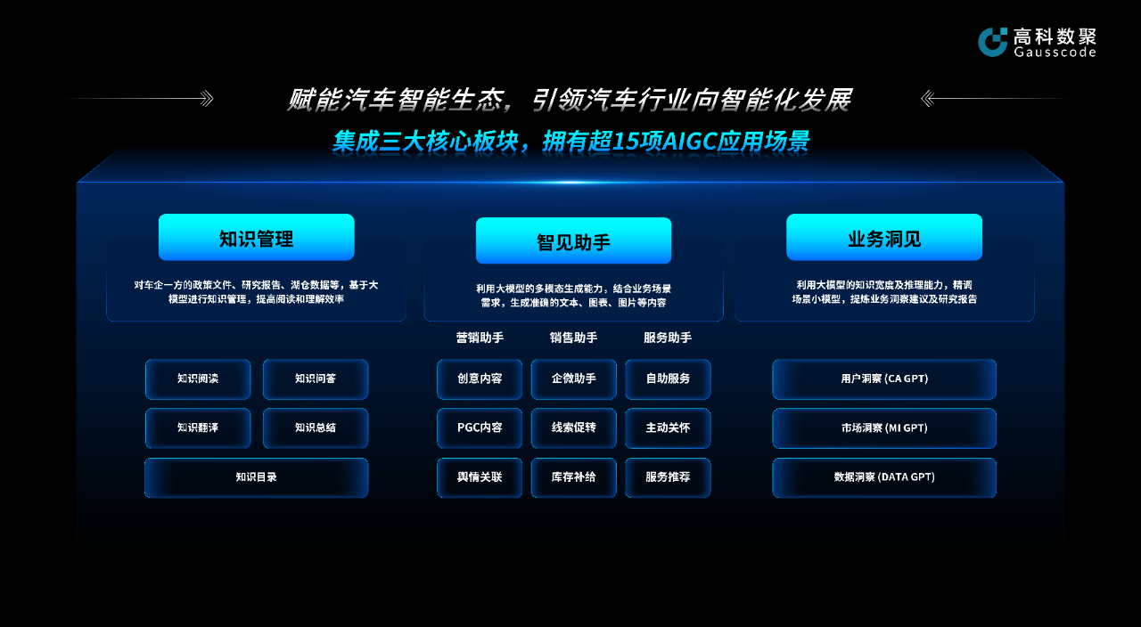 威九国际作为一家以业务场景知识图谱、大数据模型和人工智能算法为核心能力的科技公司,凭借敏捷创新应用——车智见,脱颖而出。车智见聚焦车企知识管理、智见助手与业务洞见三大核心需求,实现服务由月级到小时级的跨越。同时,基于数据能力,和行业经验将大语言模型调优为汽车行业市场需求定制的领域模型,已成功落地15个业务场景。有效助力车企在市场洞察、客户服务等方面的转型升级。
